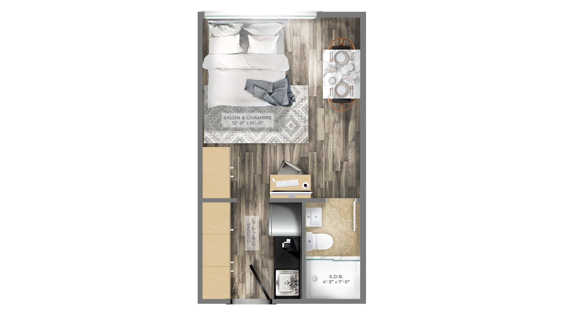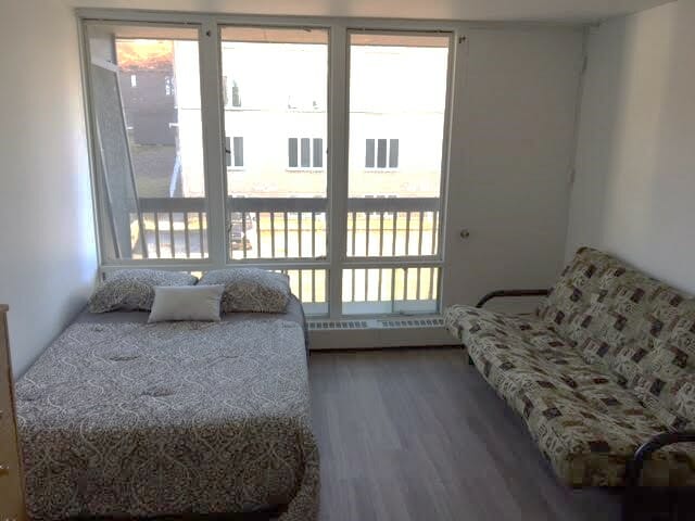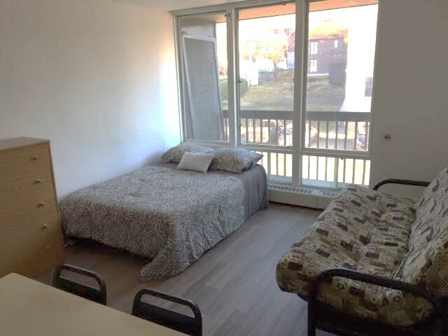 Comfortable, functional unit located close to the Université de Sherbrooke campus. An open, well-lit room serves as both a bedroom and a living room. The double bed is retractable, allowing for optimized use of the space.